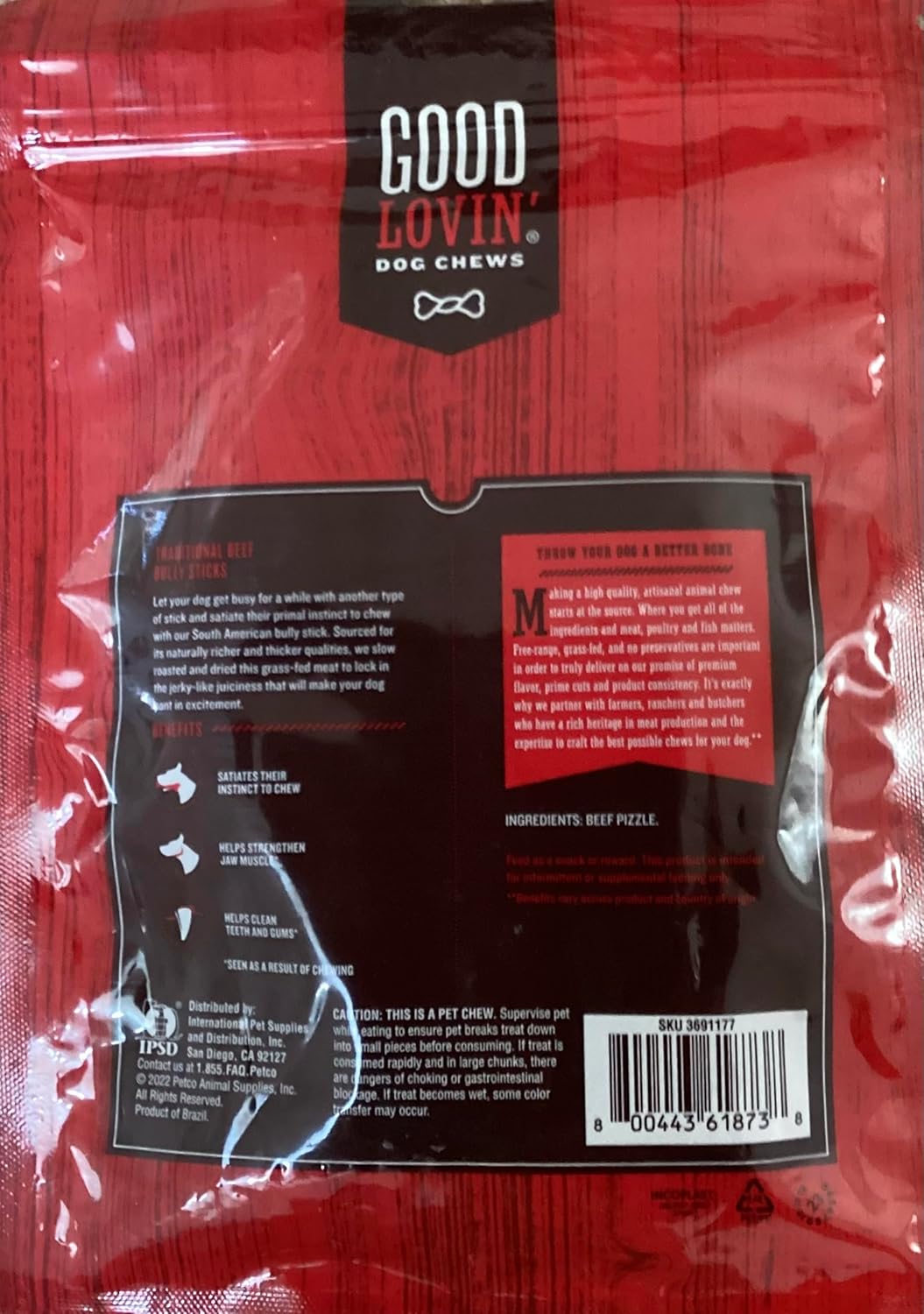 The Good Lovin' Traditional Beef Bully Stick Dog Chew dishes out delightful meaty flavor and an entertaining outlet for moderate chewers. Sourced from the ranches of South America, this classic treat helps to keep your pup's teeth and gums clean.