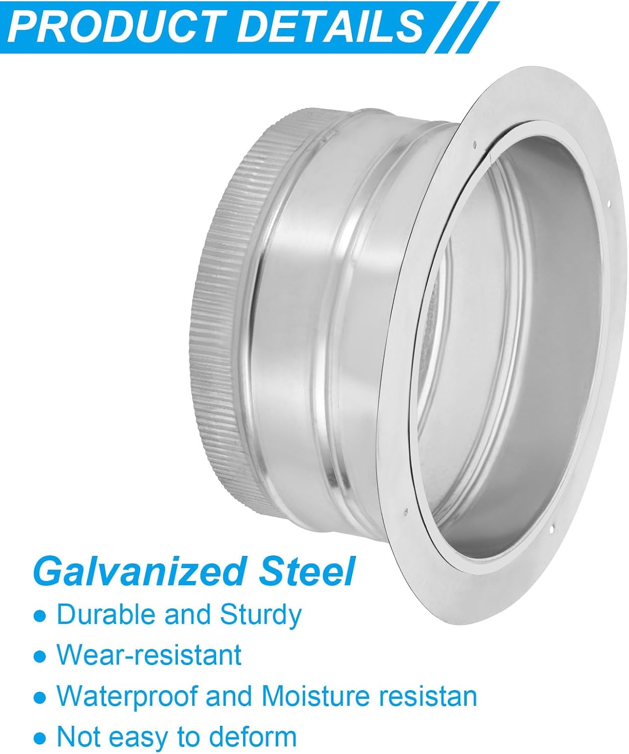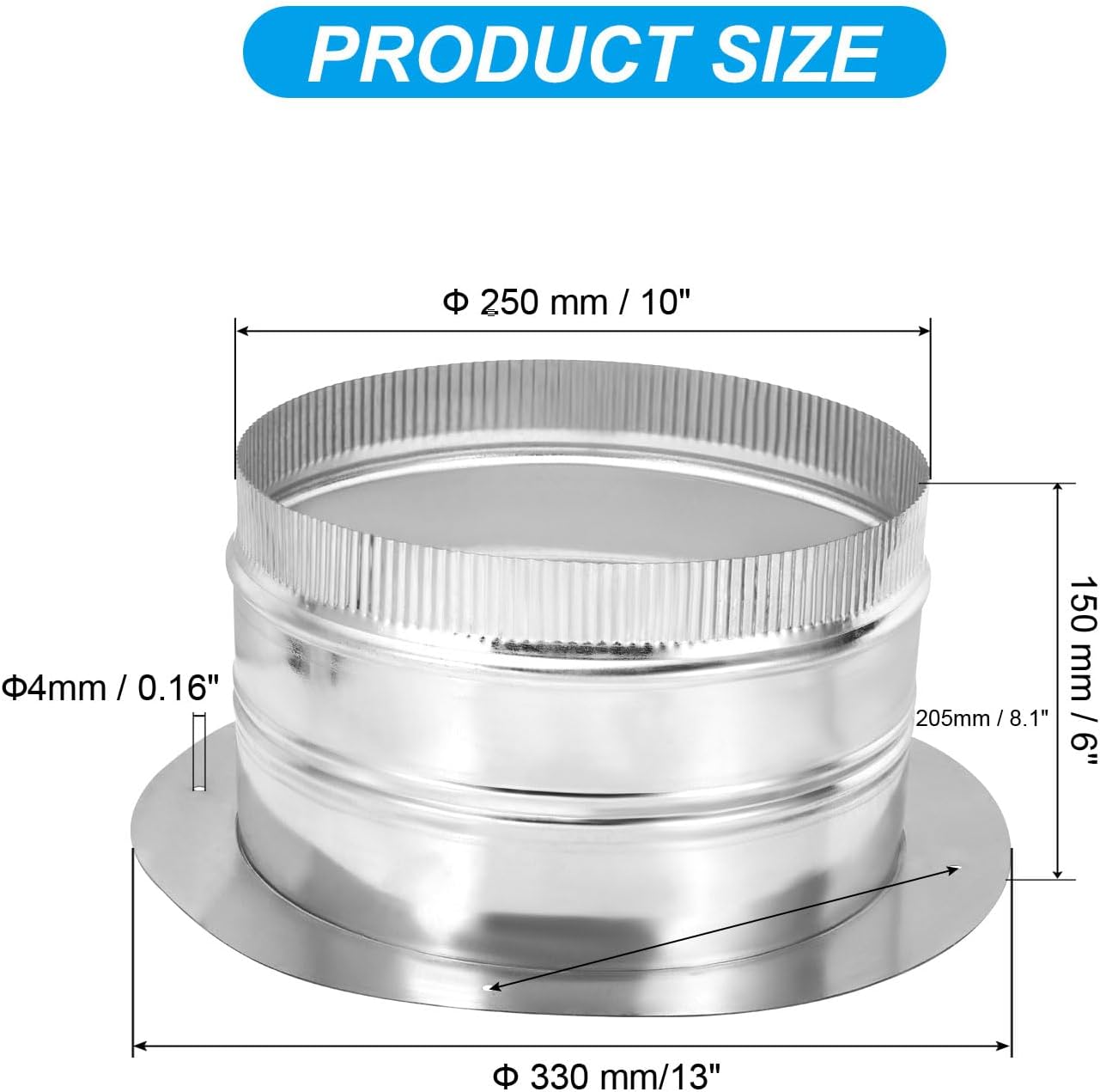 This duct collar is used for connecting air ducting, including metal spiral ducts, flexible ducts, PVC pipes, etc. It's suitable for bathroom fans, extractor fans, chimney, tumble dryers, In-line extract fans, HVAC systems, dust collection systems, hydroponics setups, etc. They are widely used in homes, offices, kitchens, factories, and apartments.SpecificationColor: Silver ToneMaterial: Galvanized SteelSize: 150 x 0.6 mm /6 x 0.02 Inch (H*T)Round Base Diameter: 330 mm/13 InchOuter Diameter of Interface: 250 mm / 10 InchMounting Hole Diameter: 4mm / 0.16 InchDistance Between Adjacent Mounting Holes: 205mm / 8.1 InchPacking List: 1 Pcs x Duct ConnectorAdvantage1. Make of durable galvanized steel material, sturdy, waterproof, moisture resistant and wear-resistant, good toughness and pressure resistant, not easy to deform, can be used for a long time;2. The crimped design allows you to connect it with ducting easily, and the textured surface can improve grip when connecting with a flexible vent duct, reducing the risk of air leaks or disconnections.3. Pre-drilled holes on the connector base ensure easy and secure installation.InstructionEasy to install: Connect the duct connector to a wall, floor, ceiling opening, or any other surface by using screws to fix it. Then connect the connector with the ducting.NOTE: Please choose the right size according to your needs. The product does not include screws