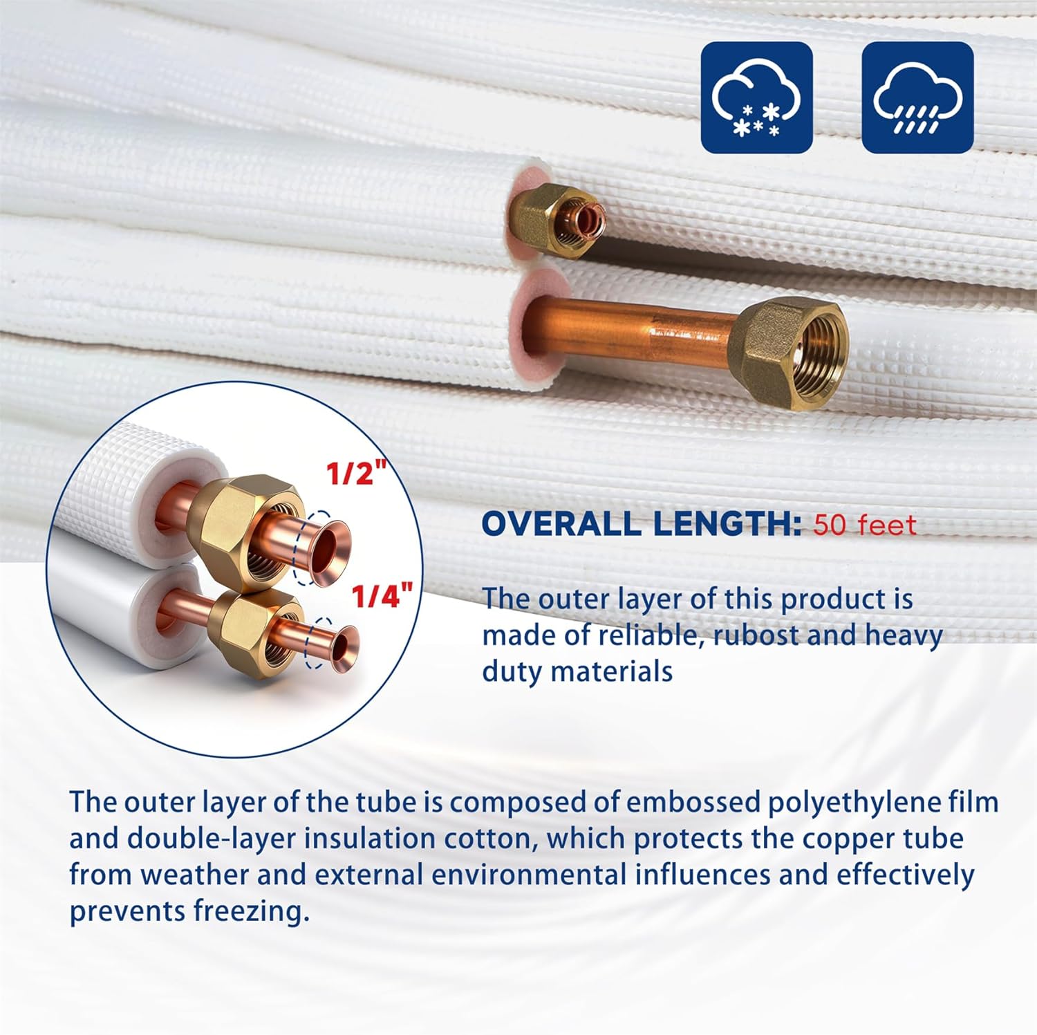 50 Foot air conditioning copper tubing pipe extension, mini split line set, 1/4 and 1/2 inch outer diameter double copper pipe air conditioning cooling connection pipe with accessoriesPeculiarity:-Air conditioning connection tube light weight, easy to install-Air conditioning connection pipe is light and economical, easy to process connection, safe and reliable, can be changed shape, high temperature and high pressure resistance-Air conditioner connection pipes connect the indoor unit to the outdoor unit. Through these connection pipes, refrigerant circulates in the system to realize the cooling or heating function of the air conditionerSpecification:Length: 50 footBrass hose diameter: 1/4 in and 1/2 inPackage Includes:1Pc 1/4 and 1/2 in x 50 ft air conditioning refrigeration connection pipe2x Pipe insulation tape1x 50 Ft electrical black cable2x Wall filling putty1x Wall sleeve cylinder1x Flexible condensate drain hose2x Decorative wall cap