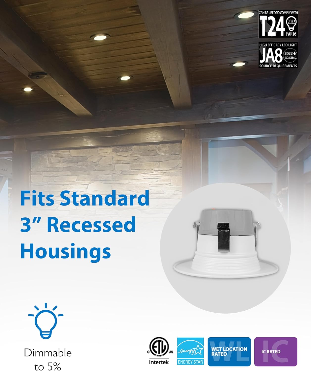 The DLR3 Select is a newly improved 3” recessed downlight offering higher lighting efficiency for residential and commercial settings. Its quick and easy installation with an IDEAL luminaire connector and friction fit mounting system, along with an Edison screw base adaptor are perfect for remodel construction, making it a breeze to replace outdated fixtures. With an impressive CRI rating of 90 and an RA value of 60, it delivers exceptional light quality, ensuring accurate color representation. Adjusting the mood settings with the 5CCT selectable switch offers options from warm 2700K to cool 5000K lighting.