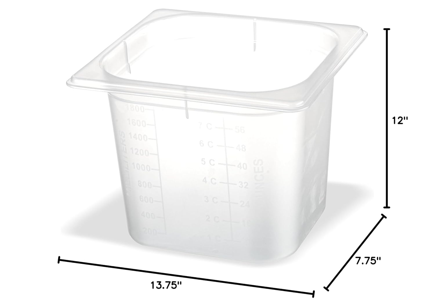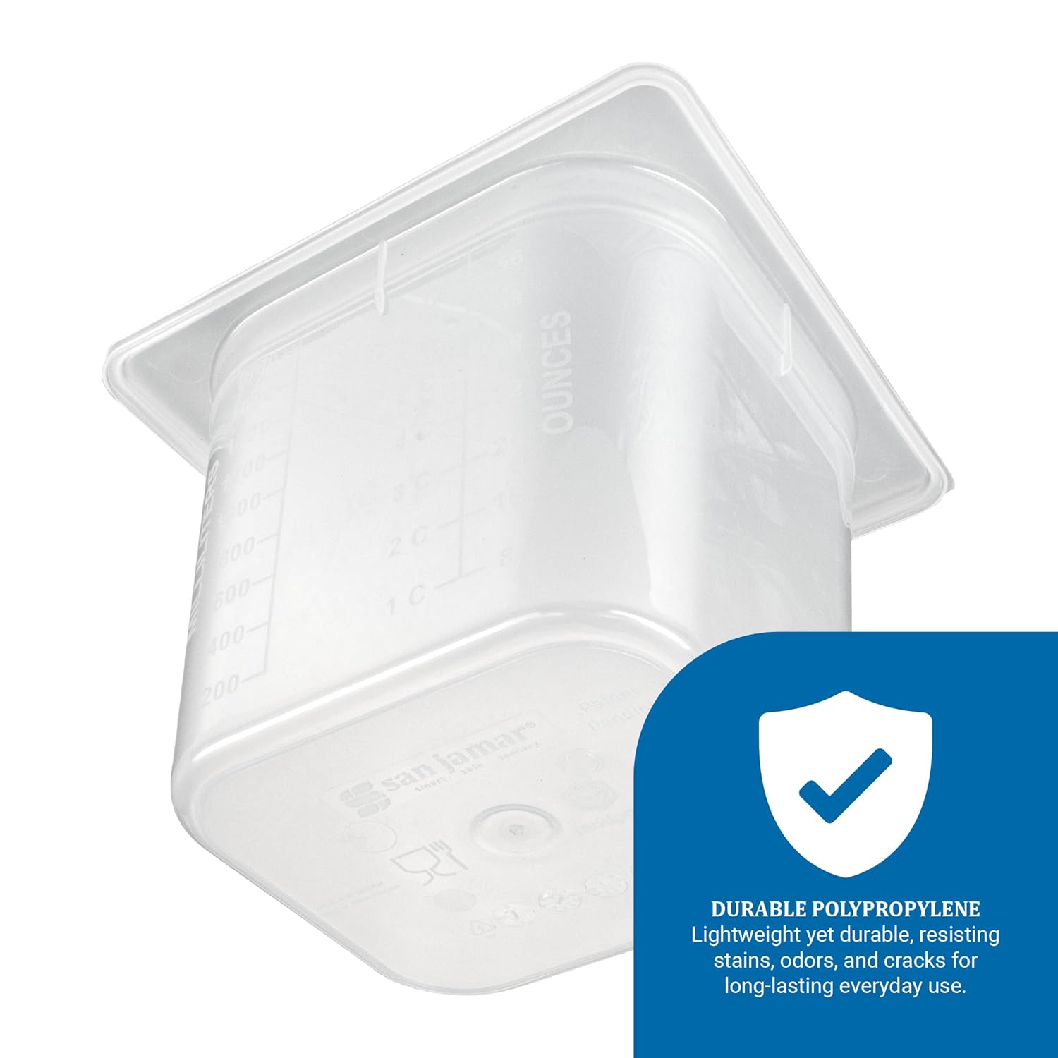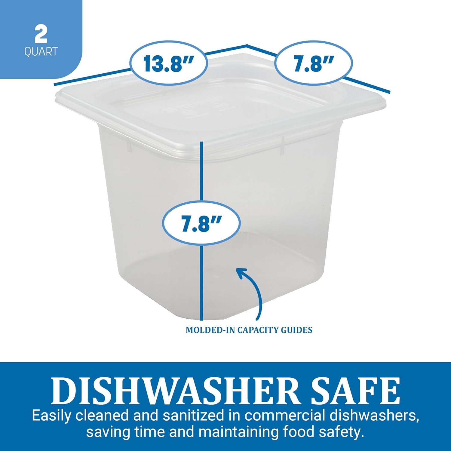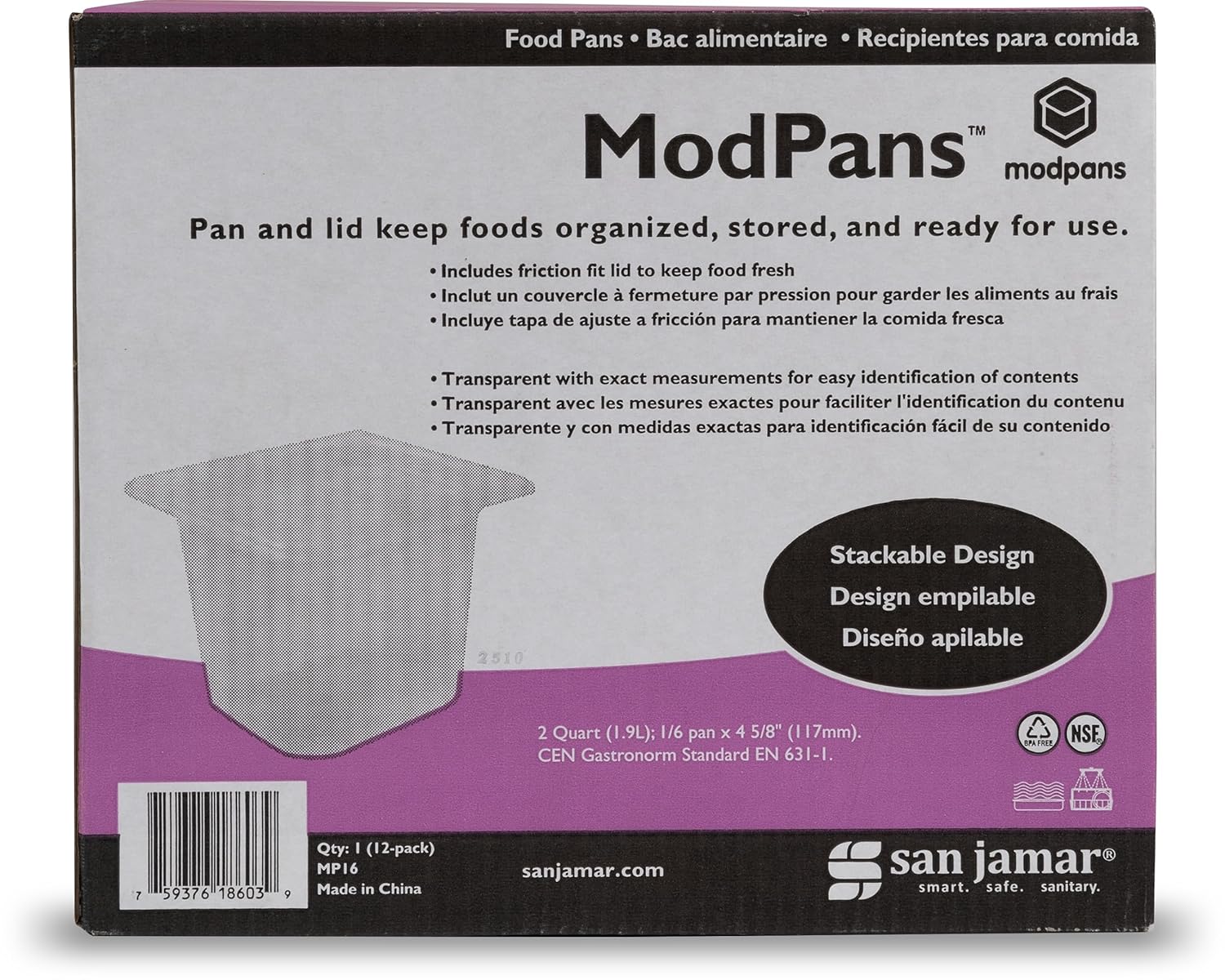 Introducing the Mod Pan 1/6 Size Food Pan - the perfect solution for all of your food storage needs. With a 2-quart capacity, this food pan is perfect for storing and serving a variety of food items, from fruits and vegetables to sauces and dressings. It is made from durable plastic, ensuring long-lasting use in even the busiest commercial kitchens. The Mod Pan™ 1/6 Size Food Pan is stackable, allowing you to maximize your storage space and keep your kitchen organized. The friction-fit lid provides a tight seal to keep your food fresh and secure during transport. This food pan is translucent, allowing you to easily identify its contents without having to remove the lid. It also features molded-in portions to help you portion out your food and maintain consistency in your recipes. The Mod Pan™ 1/6 Size Food Pan is NSF listed, ensuring that it meets the highest standards for safety and sanitation in the foodservice industry. Invest in the Mod Pan™ 1/6 Size Food Pan for a reliable and practical solution to your food storage needs. Order now and experience the quality and convenience that only a Mod Pan™ can deliver.