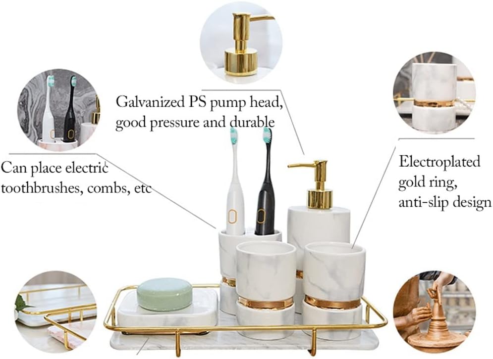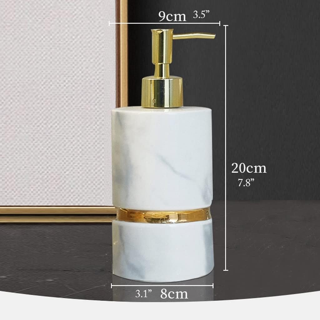 Soap dispenser features: quantitative hand soap out, avoid contact can use soap to clean hands and other hygiene, very convenient and hygienic. Product name: bathroom set Material: Ceramic Soap Dispenser Capacity: 200ml/6.7oz Soap Dispenser Size: 8x20cm/3.1x7.8in Products include: Soap Dispenser*1 5-piece set: Lotion bottle x 1 + Toothbrush holder x 1 + Mouthwash cup 2 + Soap dish x 1 Note: Decorations (such as soap, toothbrush, toothpaste, trays, etc.) are not included. notes: 1. Please note that there may be a little color difference due to different monitors. Thanks! 2. Due to manual measurement, there may be some errors, please allow 2-3 cm difference. wish you a happy life.